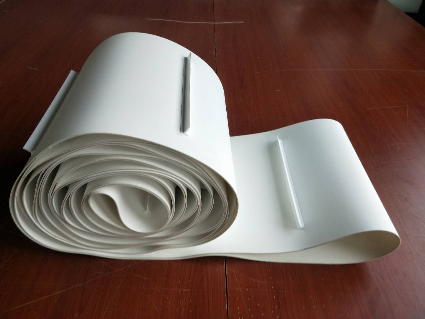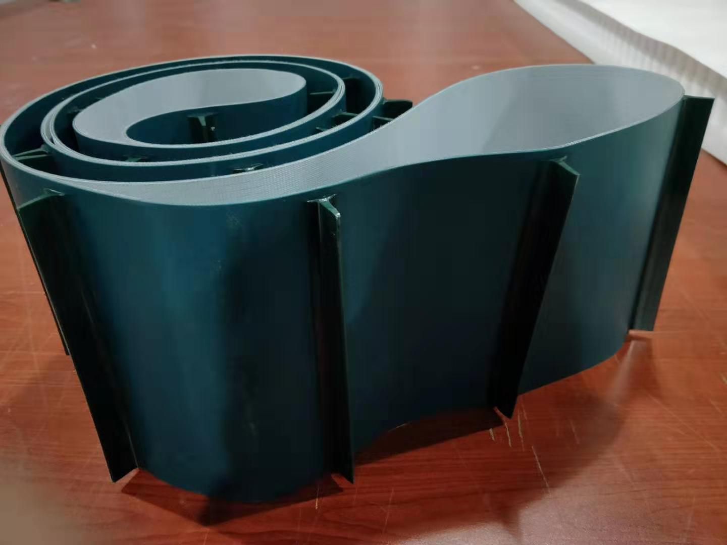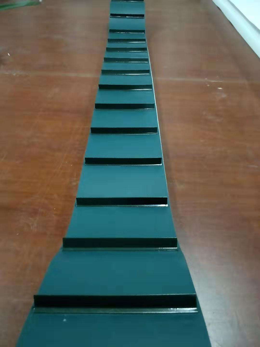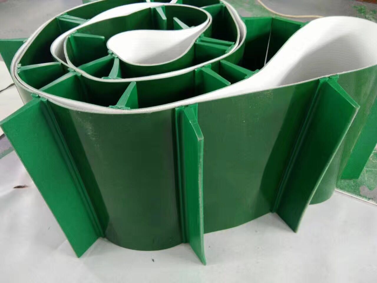 產(chǎn)品材料說明:擋板加工說明:輸送帶(裙邊擋板帶),擋邊起防止物料測滑撒落的作用。為便于轉(zhuǎn)彎,裙邊設(shè)計成波紋狀;橫隔板的作用是承托物料,為了實現(xiàn)大傾角輸送,采用T型TC型。檔邊和橫隔板是用二次硫化的方法與基帶連接的,具有很高的連接強度。用于輸送易散落的粉狀、粒狀、小塊狀、糊狀及液態(tài)狀物料。輸送帶材料:環(huán)保型材料:輸送帶的生產(chǎn)原材料,產(chǎn)品配方科學(xué)合理,符合食品衛(wèi)生標(biāo)準(zhǔn)可與食品直接接觸,色澤適度,無異味