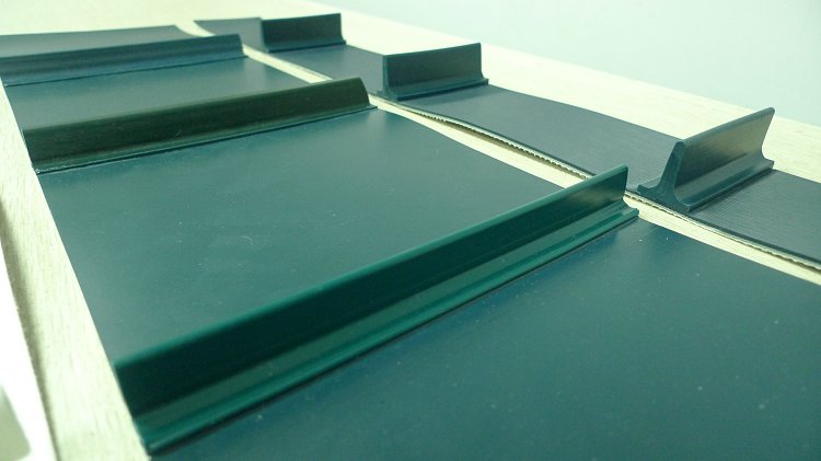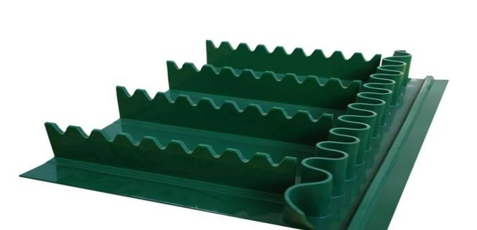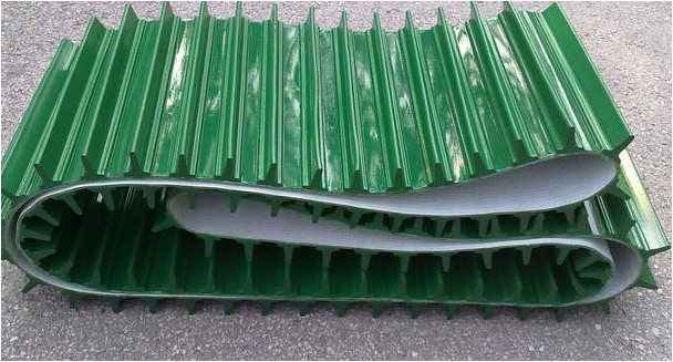 輸送帶(裙邊擋板帶),擋邊起防止物料測滑撒落的作用。為便于轉(zhuǎn)彎,裙邊設(shè)計成波紋狀;橫隔板的作用是承托物料,為了實現(xiàn)大傾角輸送,采用T型TC型。檔邊和橫隔板是用二次硫化的方法與基帶連接的,具有很高的連接強度。用于輸送易散落的粉狀、粒狀、小塊狀、糊狀及液態(tài)狀物料。