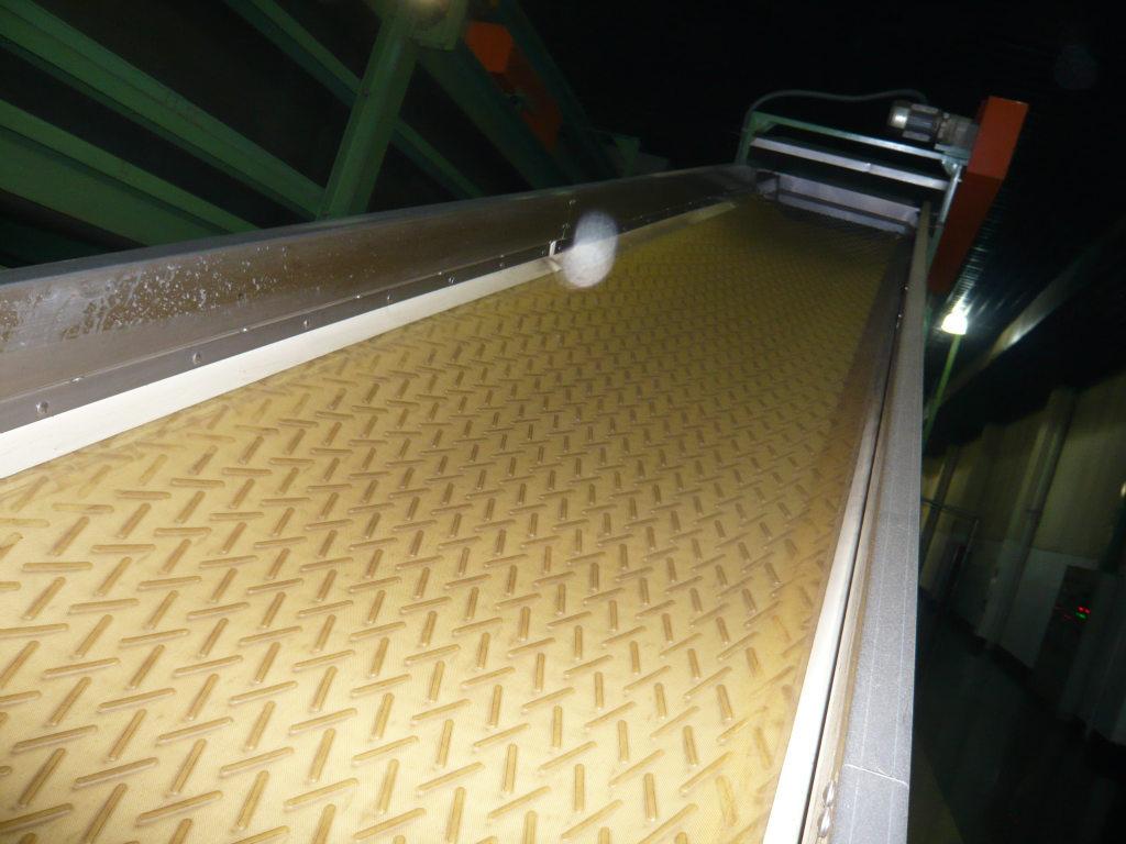 PU白色食品輸送帶(裙邊擋板帶),擋邊起防止物料測(cè)滑撒落的作用。為便于轉(zhuǎn)彎,裙邊設(shè)計(jì)成波紋狀;橫隔板的作用是承托物料,為了實(shí)現(xiàn)大傾角輸送,采用T型TC型。檔邊和橫隔板是用二次硫化的方法與基帶連接的,具有很高的連接強(qiáng)度。用于輸送易散落的粉狀、粒狀、小塊狀、糊狀及液態(tài)狀物料。